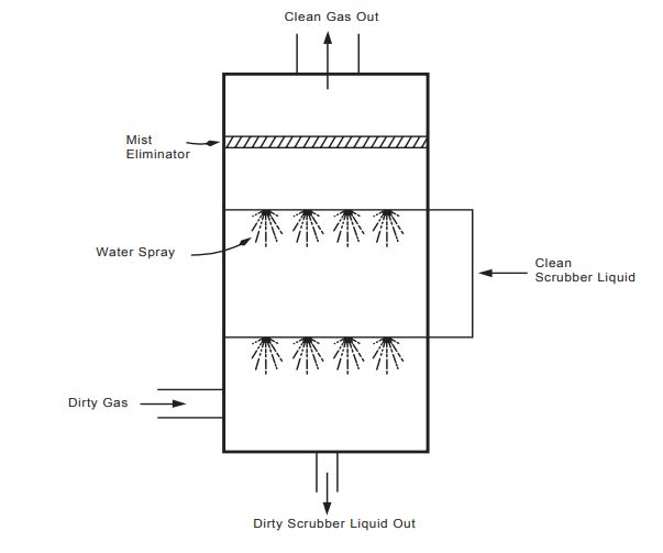 | How Does it Works | The gas flow enters at the bottom of the tower and flows upward. Water sprays downward from nozzles mounted on the walls of the tower or mounted on an array at the tower center. Water droplets capture particles suspended in the gas flow through impaction, interception and diffusion. Droplets large enough to settle by gravity collect at the bottom of the chamber. Droplets that remain entrained in the gas stream are collected on a mist eliminator upstream of the nozzles. |